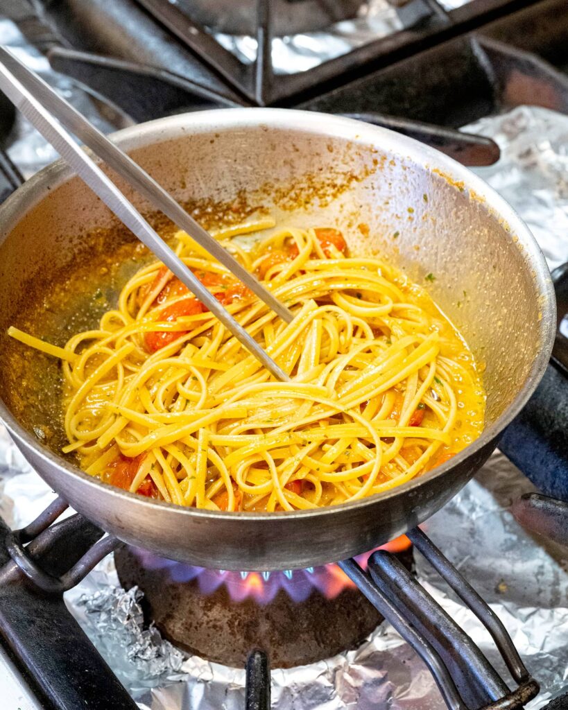 Finir la cuisson de ces 3 minutes dans la poêle avec les fruits de mer et crustacés.